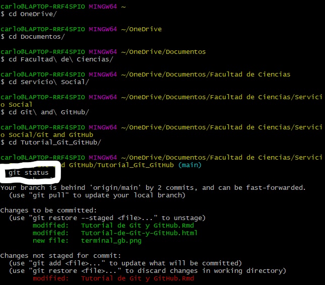 Permite conocer el estado en que se encuentran los archivos que se cambiaron o borraron antes de que se añadiera (add) y confirmara (commit) el cambio. Ejemplo de esto es lo que se muestra en la imagen de comandos principales.