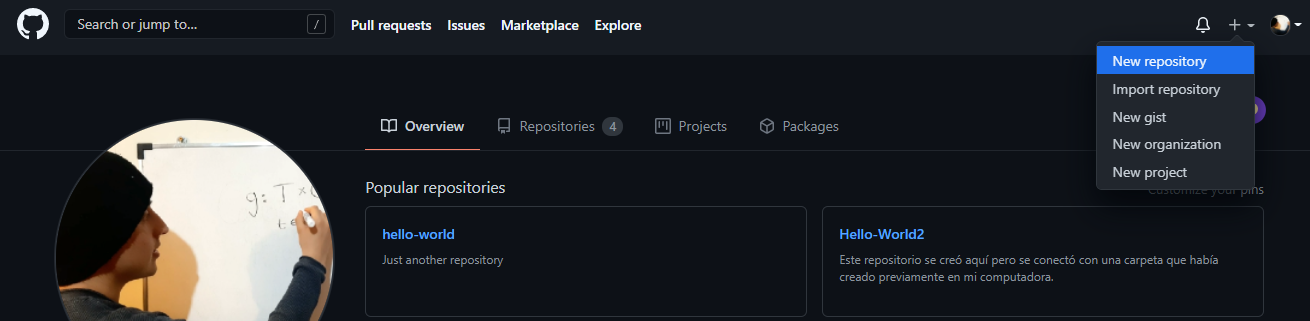 Una vez que hemos creado una cuenta en GitHub podemos hacer al menos dos cosas: trabajar en los archivos de un repositorio creado por otro usuario de GitHub o crear nuestro propio repositorio en GitHub e invitar a nuestros colaboradores para trabajar en los archivos que ahí se encuentren.