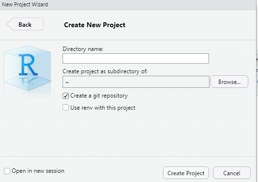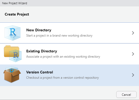 La forma más sencilla de comenzar a trabajar Git con RStudio es creando un nuevo proyecto desde RStudio y seleccionar la opción que se muestra: