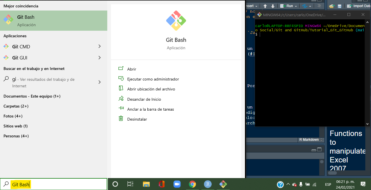 Para poder hacer uso de la terminal basta poner el buscador de Windows GitBash y dar click. Entonces aparecerá la terminal donde se escribirán todos los comandos.